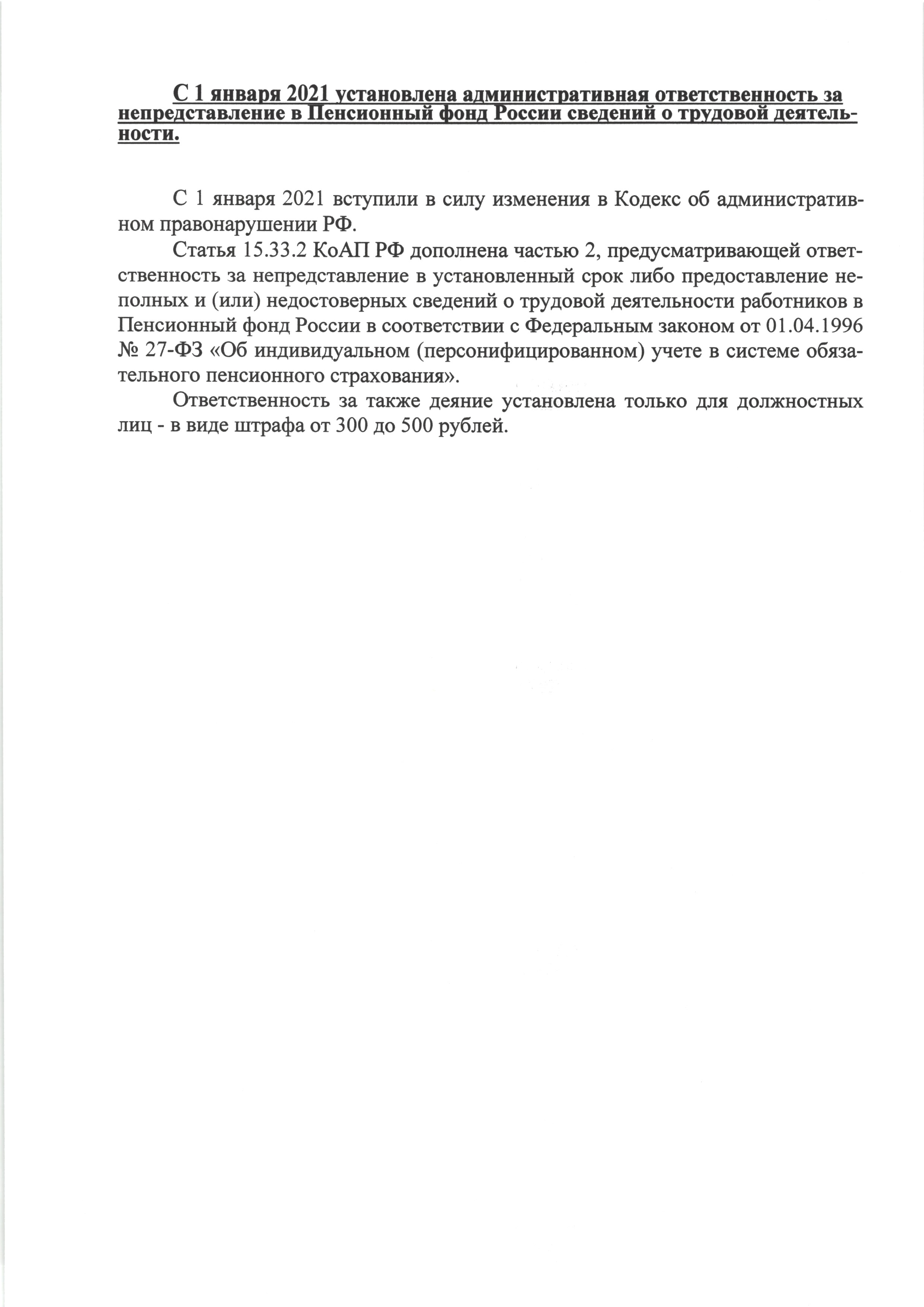 С 1 января 2021 установлена административная ответственность за непредставление в Пенсионный фонд России сведений о трудовой деятельности (прочитать)